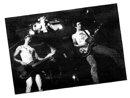 | That left the Marquee, 100 Club, and the Nashville. Eddie and the Hot Rods asked them to support at the Marquee. It was the first time they had ever used monitors, and hearing themselves caused a slight o.d. John leaping into the audience and the others kicking the monitors about. |