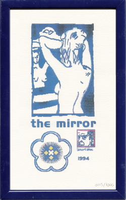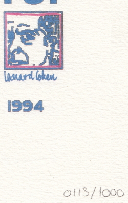 Extremely Rare Leonard Cohen framed and glazed numbered limited edition print of the artwork for "The Mirror". I bought this at a record fair at Espace Champerret, Paris in early 1995. It was implied at the time that it had been sold by FNAC but that may have been incorrect. Since then, I've never been able to find another for sale. The only mention I can find of it on the internet is here. Size 171mm x 271mm. |