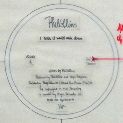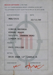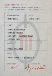 Phil Collins artwork/layout for the 7" labels for the 1989 E.P., "I Wish It Would Rain Down". The layout comes with bottom paste-up layer and attached top layer with instructions for the printers. |