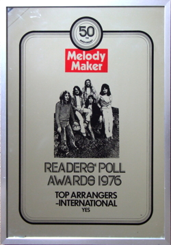 Yes Melody Maker Readers Poll Award 1976 for Top International Arrangers. These mirror awards very rarely come onto the market. It features an image of the Patrick Moraz era group above the award category. I bought this around 1988 when I was still doing Scottish record fairs. It came from a dealer based on the Black Isle who was more into beatnik and underground memorabilia and was clearing any prog items he had. As I said in the intro to this page, some items used to hang on my walls and this was one. There are two very small cracks on the bottom edge, pictured in close-up on either side of the main pimage. Unfortunately, it was like this when I got it. Size mm X mm. |